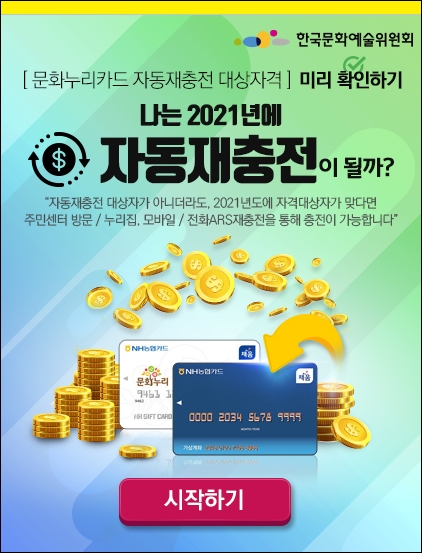 2021년 문화누리카드는 자동으로 1인당 10만원이 재충전 되세요.