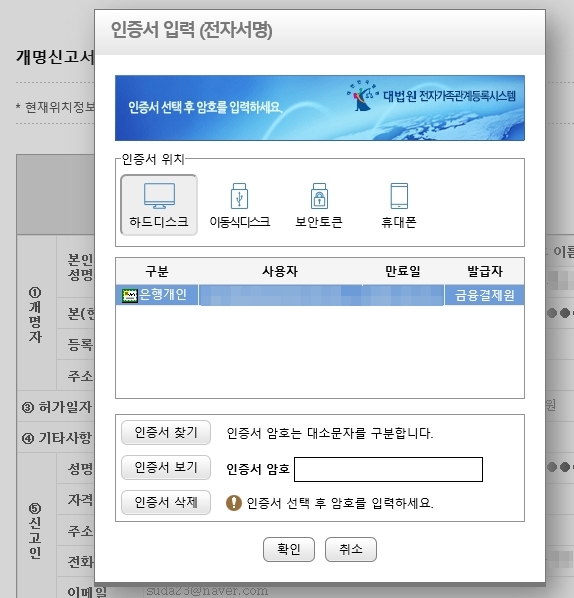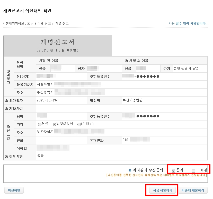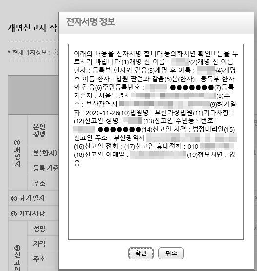 틀리는 사람이 많은지 넘어간 화면에 작성한 개명신고서가 또 떠요.