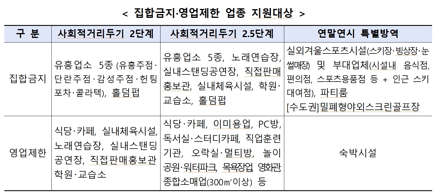 2. "감염병예방법"에 따라 중앙재난안전대책본부(이하 중대본) 또는 지방자치단체(이하 지자체)가 20년 11월 24일 이후 시행한 집합금지. 영업제한 업종(아래 표 참고)