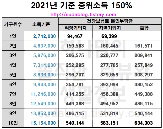 이상 2021년 기준 중위소득 150% 건강보험료 금액을 알려드렸습니다.