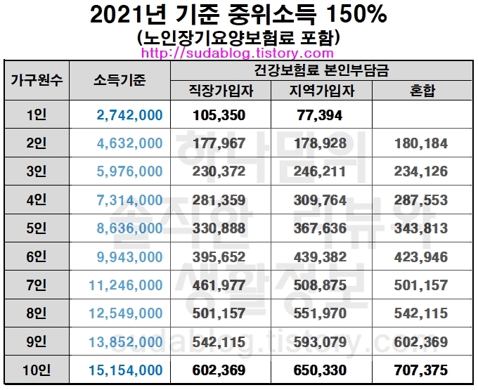 2021년 기준 중위소득 150% 건강보험료