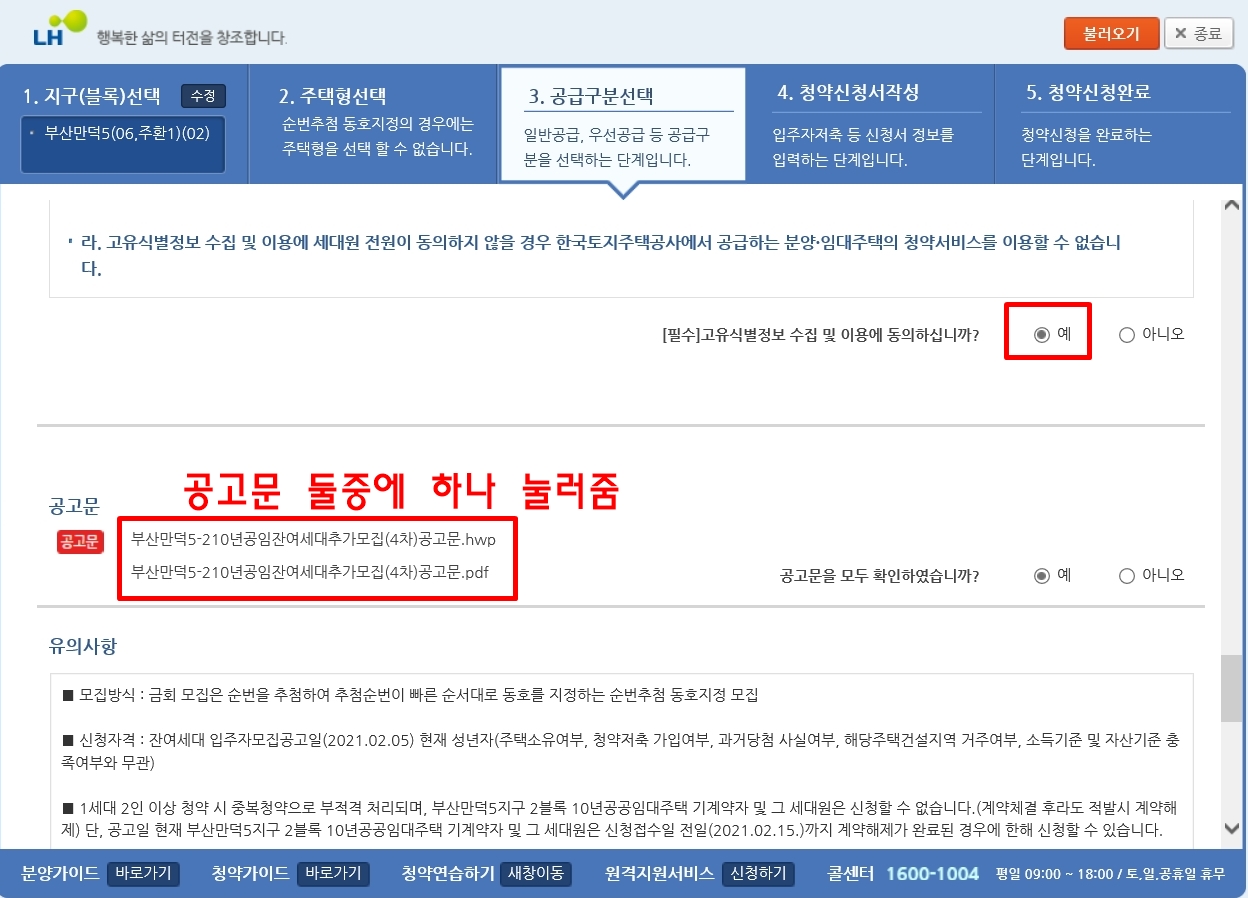 공고문은 미리 다 봤지만 한번 눌러줬어요. 그러고는 봤다고 "예" 누르면 되요.