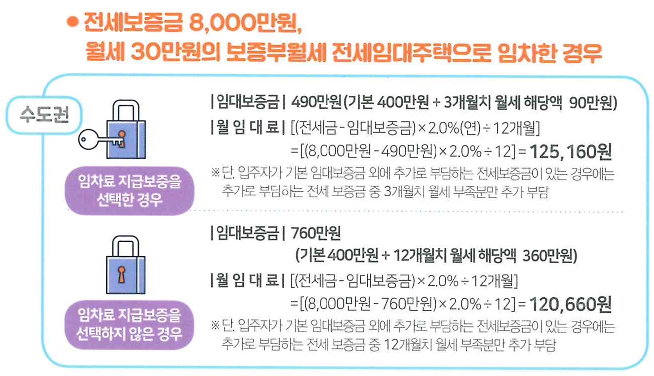 * 단, 수도권(60만원), 광역시(45만원), 기타지역(40만원) 한도의 보증부월세는 입주자가 원할 경우 3개월치 월세에 해당하는 금액만 입주자가 부담하고 9개월치 월세는 임차료 지급보증(임차인이 임대인에게 임차료(월세)를 지급하지 못할 경우 이를 책임지는 보증상품)으로 대체 가능.