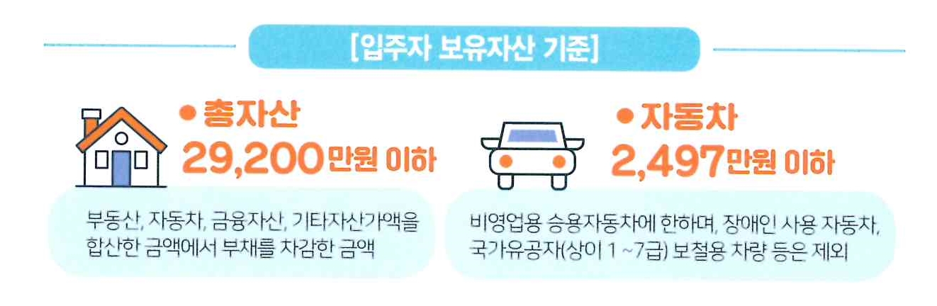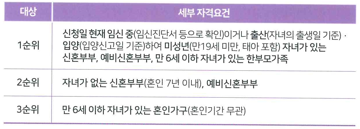 신청일 기준 아래의 순위에 해당하는 무주택세대 구성원으로서 월평균소득이 전년도 도시근로자 가구원수별 가구당 월평균 소득의 70% 이하(배우자가 소득이 있는 경우 90% 이하)이고, 국민임대주택 자산기준(총자산 29,200만원 이하, 자동차 2,497만원 이하)을 충족하는 신혼부부, 예비신혼부부, 한부모가족, 유자녀 혼인가구.