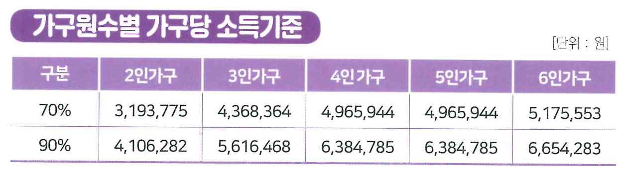 * 다자녀가구(신청일 현재 미성년자인 3명 이상의 자녀(태아 포함)를 둔 가구) 또는 가구원수가 5인 이상인 경우는 국민주택 규모(전용면적 85㎡) 초과 주택 지원 가능.