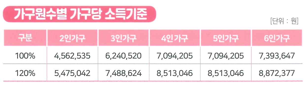 *다자녀가구(신청일 현재 미성년자인 3명 이상의 자녀(태아 포함)를 둔 가구) 또는 가구원수가 5인 이상인 경우는 국민주택 규모(전용면적 85㎡) 초과 주택 지원 가능