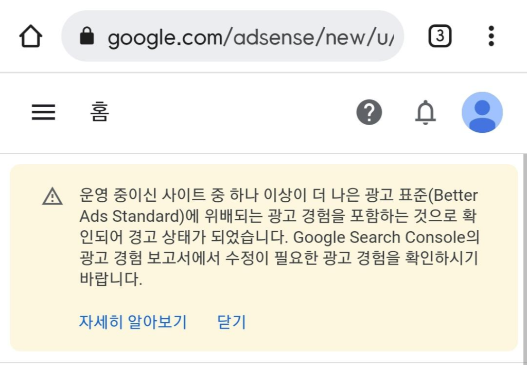 "운영 중이신 사이트 중 하나 이상이 더 나은 광고 표준(Better Ads Standard)에 위배되는 광고 경험을 포함하는 것으로 확인되어 경고 상태가 되었습니다. Google Search Console의 광고 경험 보고서에서 수정이 필요한 광고 경험을 확인하시기 바랍니다."