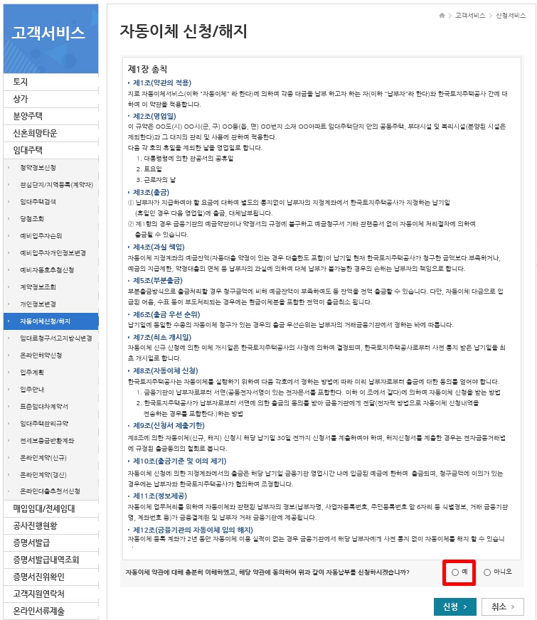 밑에 쭉 내려보면 "예"에 체크하고 그 밑에 있는 [신청] 누릅니다.