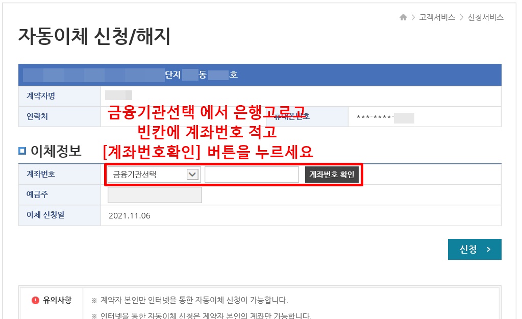 ※ 계약자 본인만 인터넷을 통한 자동이체 신청이 가능합니다.