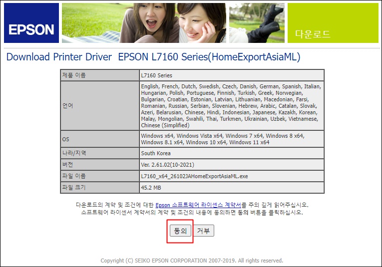 여기서 밑에 [동의]버튼 누르면 프린터 드라이브 파일 다운로드가 되요.
