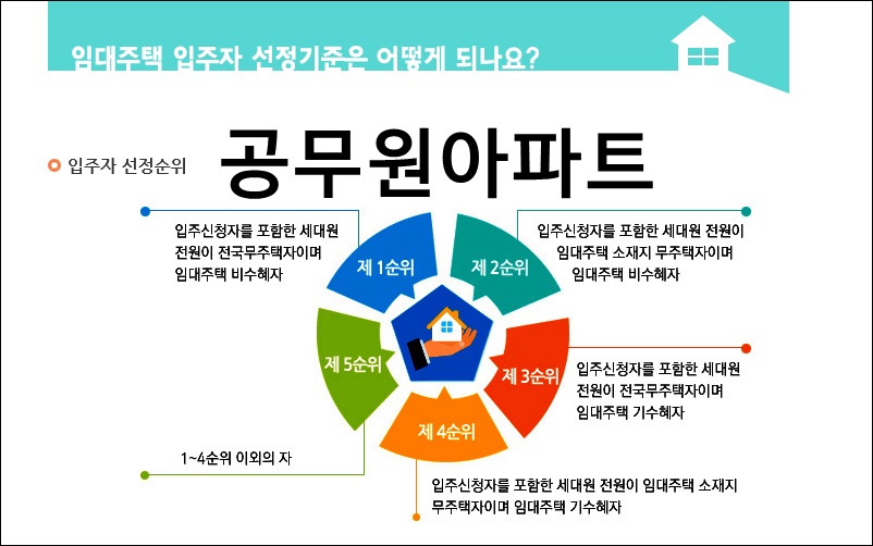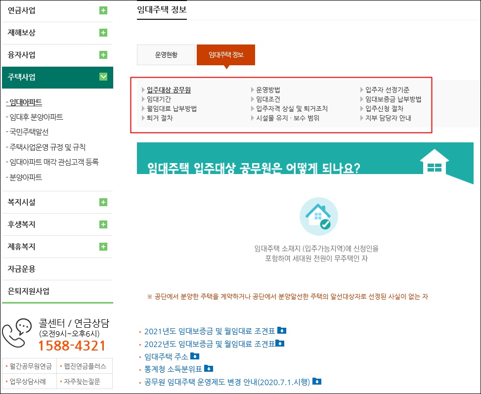 임대주택 정보 탭을 눌러보시면 입주대상 공무원, 입주자 선정기준, 임대조건이나 기간 등등 공무원 임대아파트에 관한 상세 내용을 보실 수 있네요.