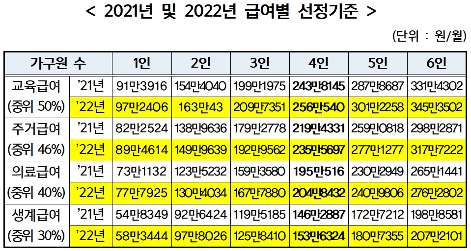 생계급여는 선정기준이 최저보장수준으로, 각 가구별 2022년 생계급여 수급비가 위의 금액입니다.