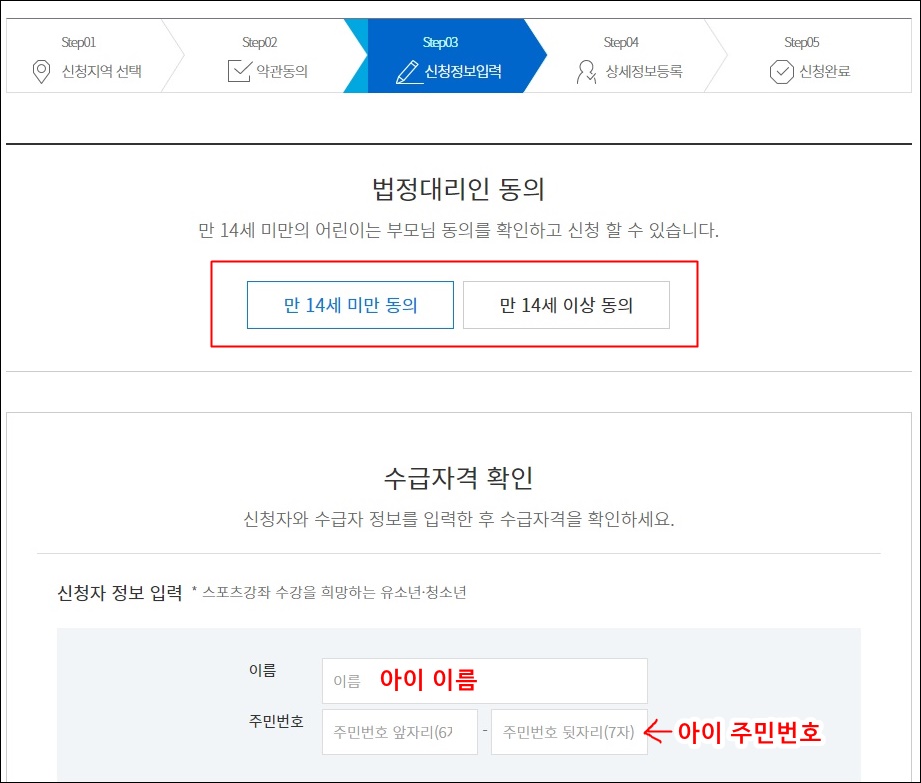 스포츠바우처를 이용할 아이 이름과 아이 주민번호를 넣으시고