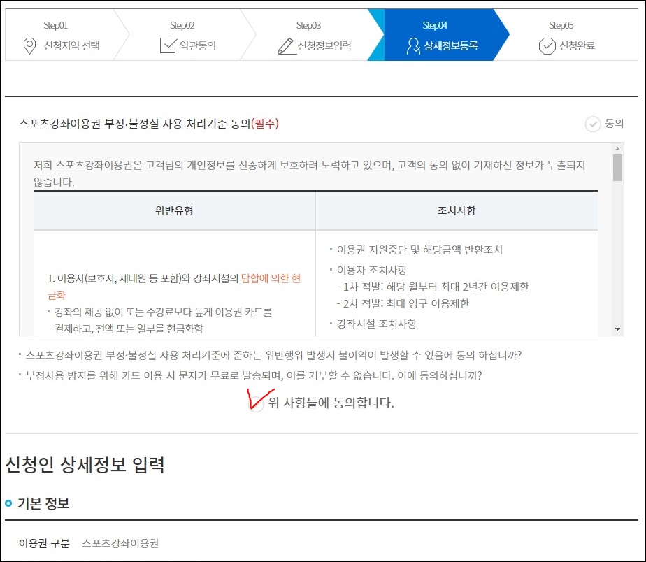 스포츠바우처를 이용할때 쓰일 카드(신한카드) 관련해서도 입력을 합니다.
