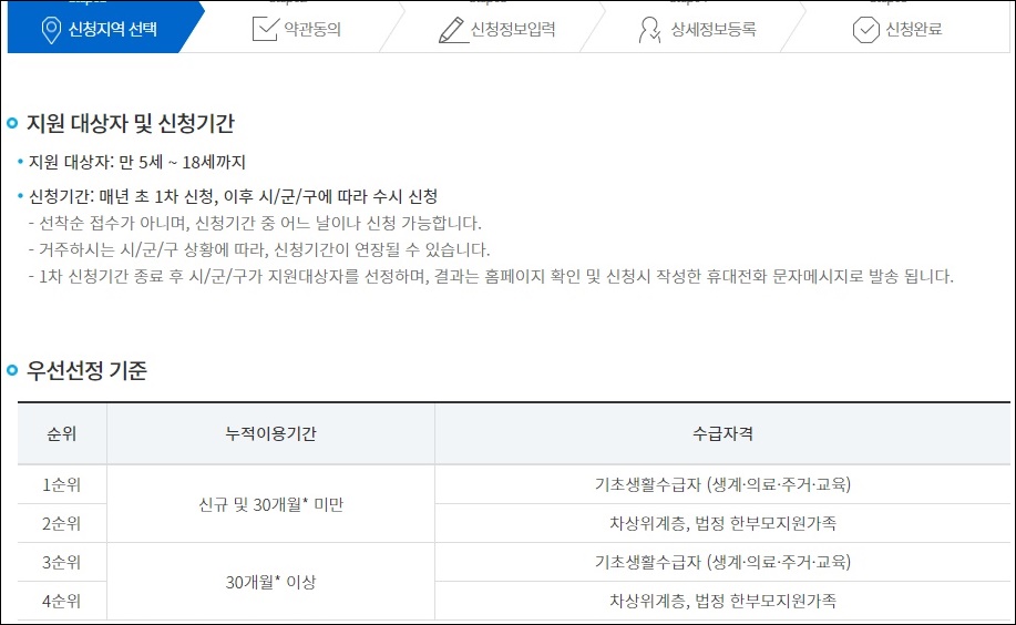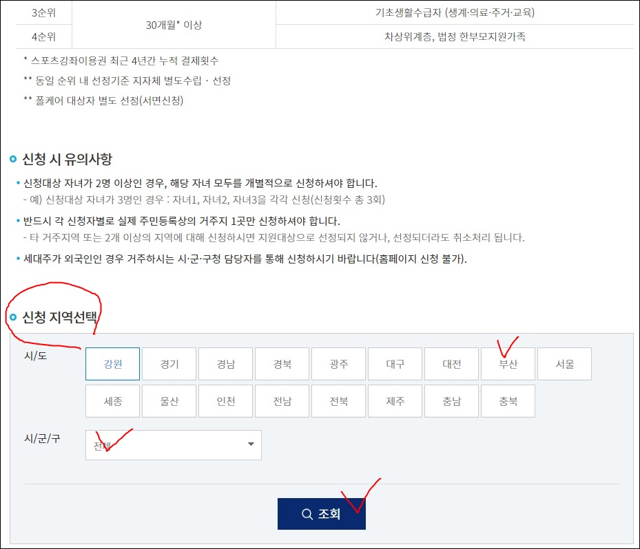 예를 들어서 아이 주소가 부산 진구로 되어있는데 곧 이사할껀데 싶어서 아직 전입안한 다른 지역으로 신청 넣으면 선정이 되지않거나, 선정되셨다가도 취소처리 되실 수 있습니다. 현재 아이의 주민등록상 주소지를 선택해서 신청하셔야 되요.