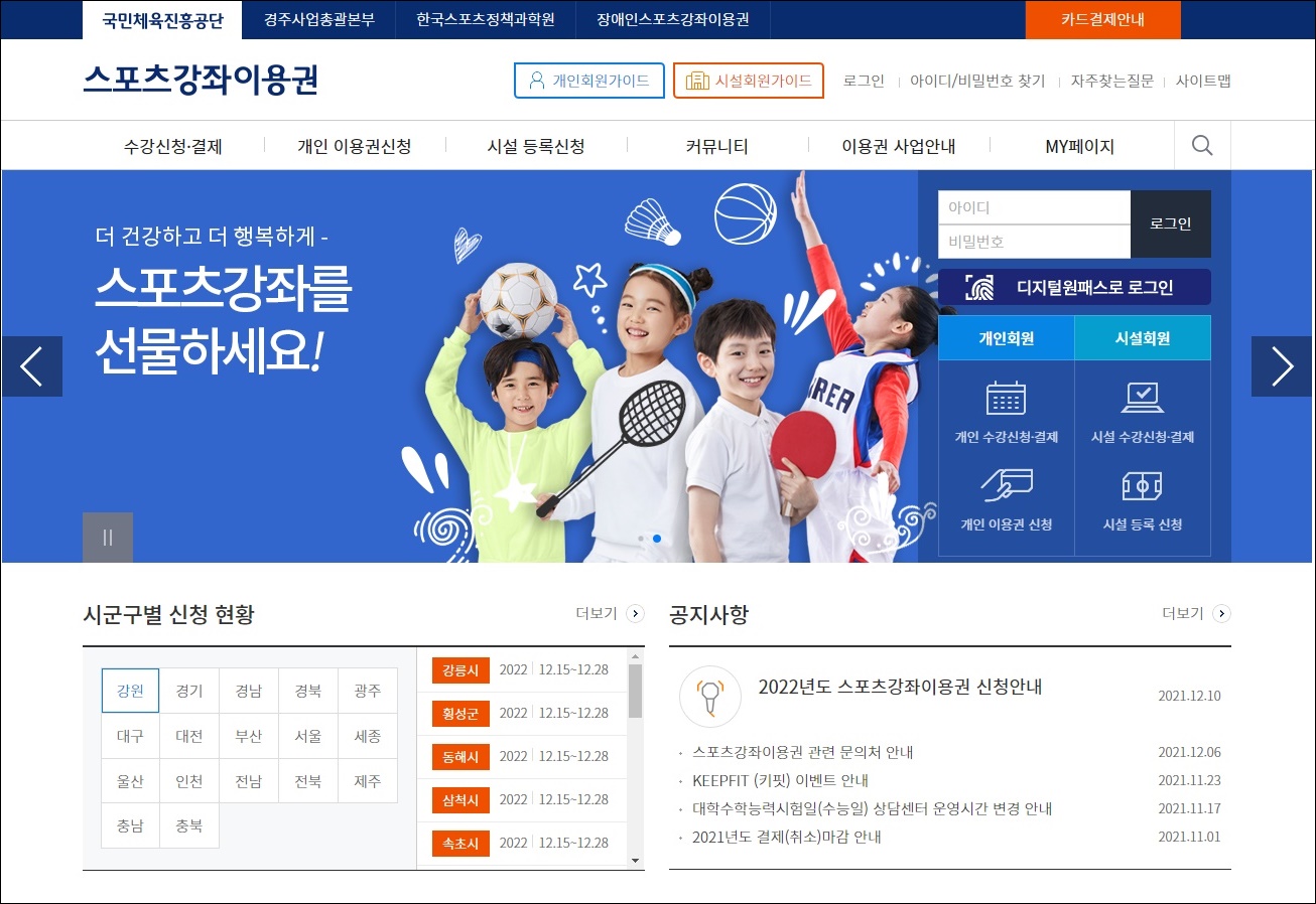 12월 15일부터 2022년인 내년 스포츠바우처 신청을 받고있어요.