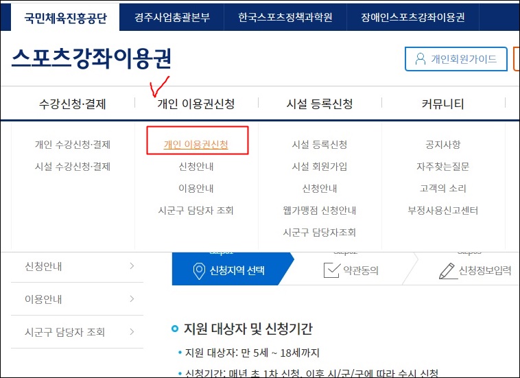 밑에 그림이 스포츠바우처 홈페이지 첫화면 그림인데 위에도 메뉴가 있고 오른쪽에 아이들 옆에 손에 카드들고 있는 아이콘에도 "개인 이용권 신청"이라고 써진게 있죠? 폰으로 들어가면 파란색 저 아이콘이 딱 보여요.