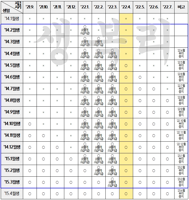 아래는 2022년 만 8세미만 아동수당 확대로 인해 14년생부터 15년연초생들 아동수당 다시 지급받는 달 입니다.