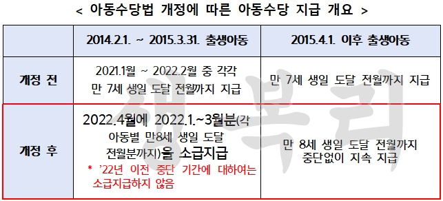 이번 아동수당법 개정으로 2022년 1월부터 만 8세 미만 지급이 적용되지만, 전산시스템 개편 등 시행 준비로 인해 실제 지급은 2022년 4월부터 시작될 예정입니다.