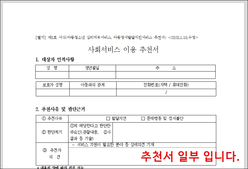 이상 부산지역사회서비스투자사업 아동청소년 심리치유서비스(우리아이가 달라졌어요!), 아동정서발달지원서비스 바우처 추천서 양식 이었습니다.