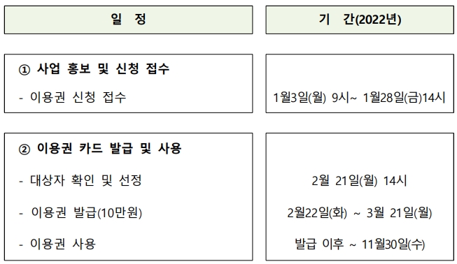 발표일 이후인 2월 22일(화)부터 3월 21일(월) 사이에 바우처 이용 전용카드 발급 신청을 받습니다.