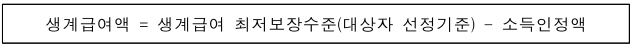 선정기준 금액에서 가구별 소득인정액을 제외한 금액이 실제 생계급여(=생계 수급비) 입니다.