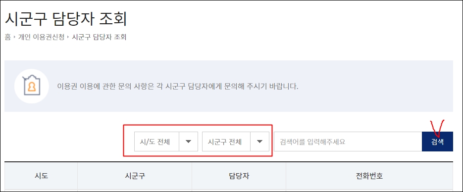 사시는 지역 선택 후 검색 누르면 담당자 번호가 떠요.