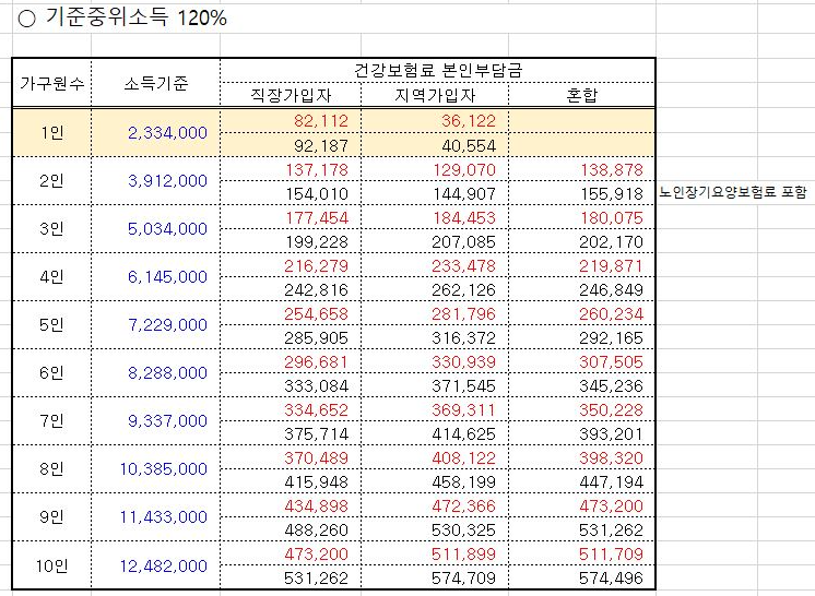 2022년 기준 중위소득 120% 이하 건강보험료