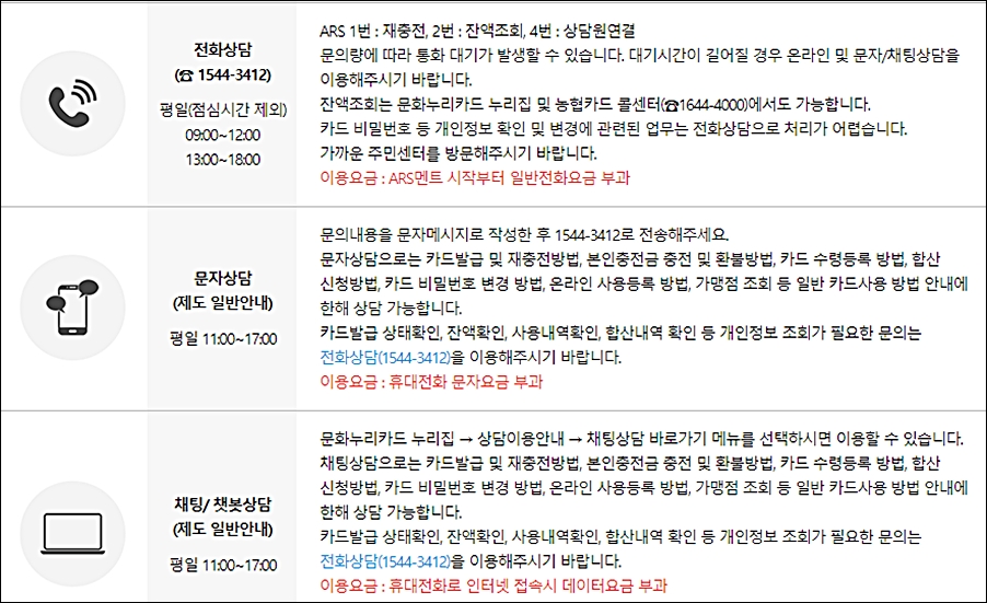 홈페이지, 모바일앱, ARS 관련 문의는 문화누리카드 홈페이지의 고객센터 게시판이나 문화누리카드 고객센터 전화 ☎1544-3412로 하시기 바랍니다.