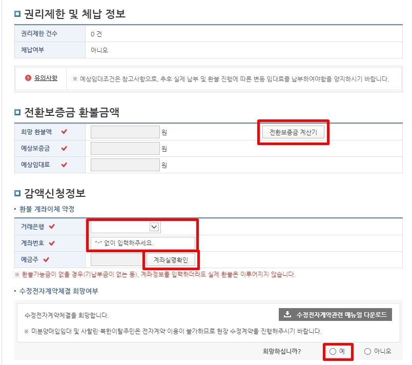 - (전환보증금 증액금 반환 및 감액) 임대보증금의 월임대료 전환은 체납여부.채권관계 등에서 문제가 없고 본인계좌인 경우에 한하여 온라인 신청(계약기간 중 온.오프라인 신청을 모두 포함하여 2회에 한함)이 가능하며, 계좌번호 등에 오류가 있을 경우 추가요청이 있거나 온라인 진행이 불가할 수 있음을 알려드립니다. 환부액 지급완료 후 방문 또는 전자계약을 통해 수정계약을 체결하시기 바랍니다.