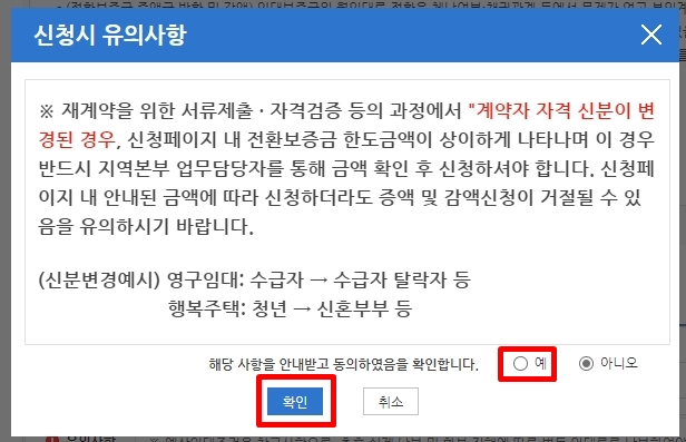전환보증금 신청 안내문이 써있고 확인했다고 체크하는데 안내 내용 한번 적어보면 이렇습니다.