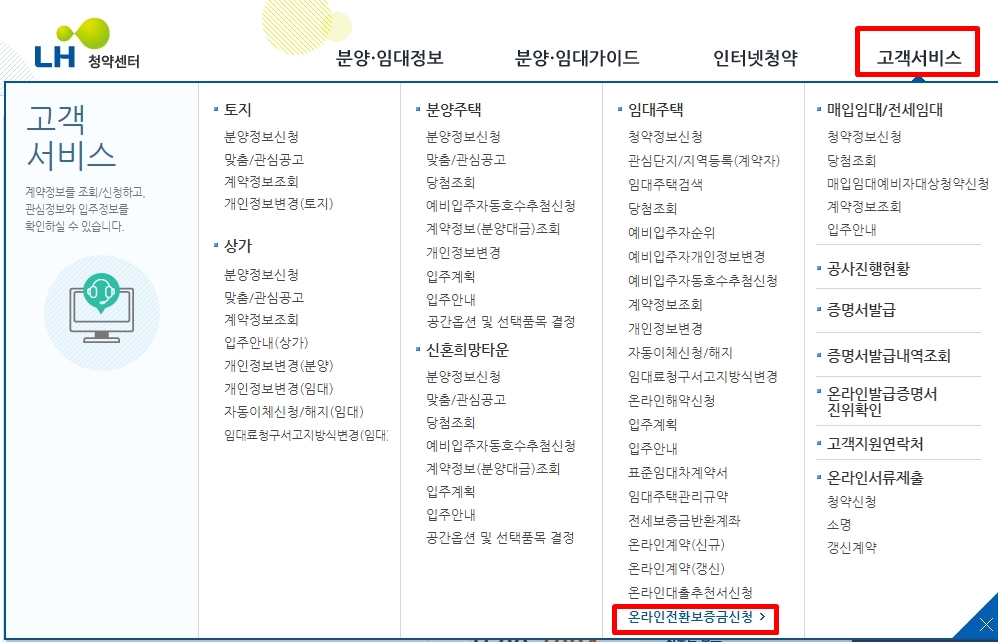 맨 아래에 온라인전환보증금신청 이라는 메뉴가 있어요.