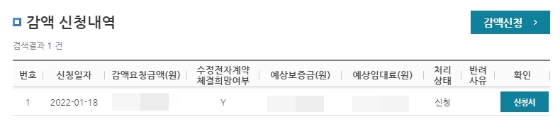 [신청서]라는 버튼 눌러보면 바로 위에 저 동의체크하고 감액신청한 저 내용입니다.