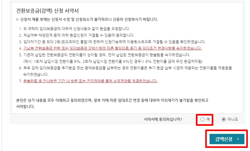 마지막으로 또 전환보증금(감액) 신청 서약서 내용이 줄줄 써있고 동의하냐고 또 체크합니다.