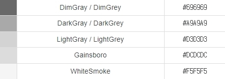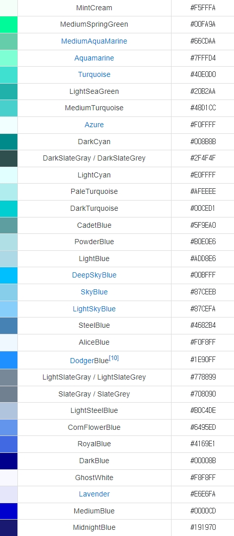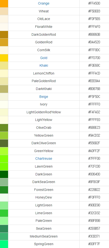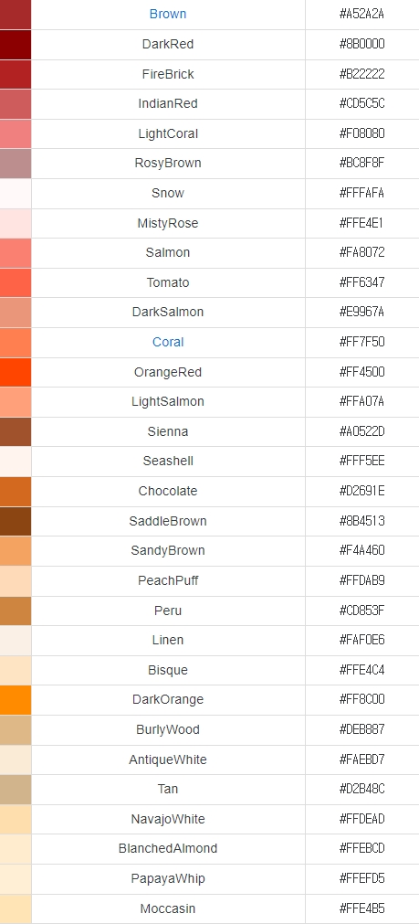 그래서 영어로 써진 색상명 같이 있는 색상코드표를 가져와 봤습니다.