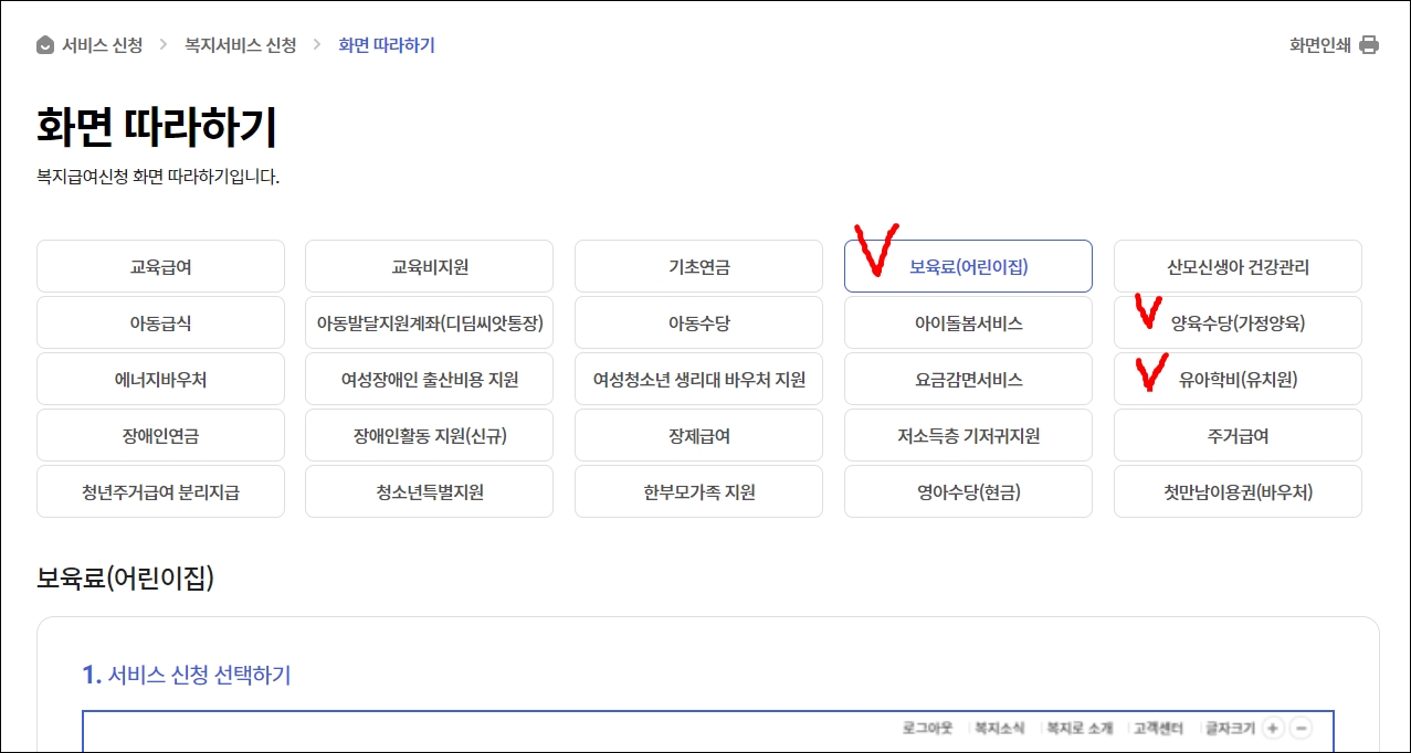 상세한 신청화면은 복지로에 화면따라하기에서 해당 서비스(위에 서비스중에서 신청할 것 선택) 누르시면 나오니 참고해주세요.