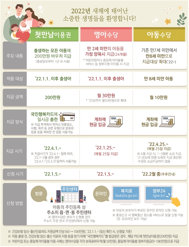 그래서 2022년 출생아부터는 첫만남이용권과 영아수당을 받을 수 있는데 신청 및 지급시기에 대해 알려드려 봅니다.