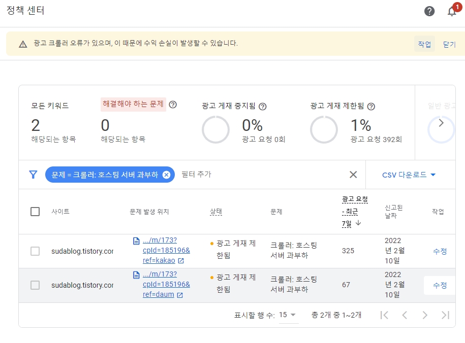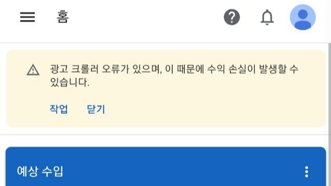 애드센스 크롤러 오류가 나면 애드센스 수익페이지 윗쪽에 메시지가 떠있어요.