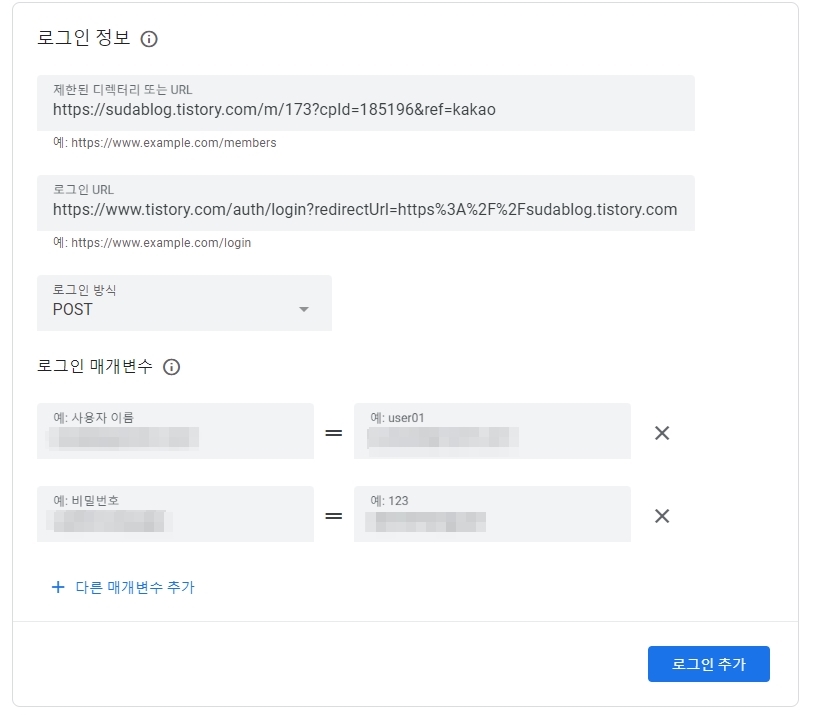 거기 [로그인 추가]라고 버튼을 누르고 로그인 정보 등록을 해줍니다. (아래 그림. 칸마다 상세 설명은 밑에 있어요)