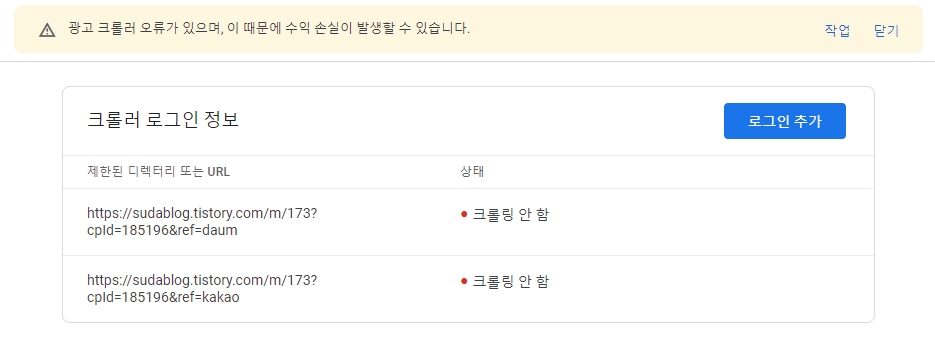 하지만 아직 광고 크롤러 오류 메시지는 사라지지 않았었죠.