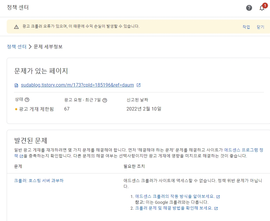 제가 애드센스에 크롤러 오류 메시지가 뜬게