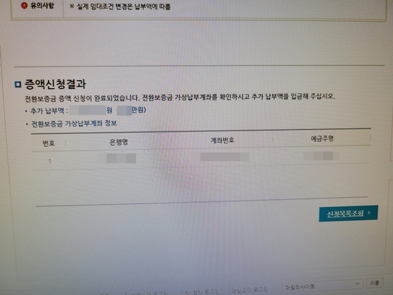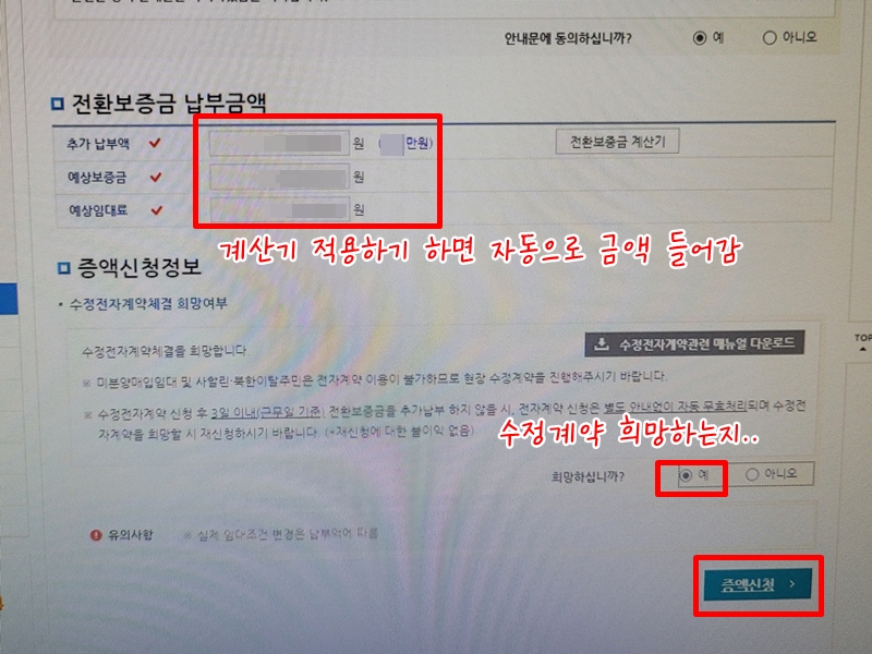 "온라인 증액신청은 "전환보증금 납부 계좌 확인" 및 "수정전자계약 신청"을 위한 것으로, 신청만으로는 자동 납부되지 않으니 반드시 계좌 확인 후 희망 증액금을 납부 하여 주시기 바랍니다." 라고 써있습니다.