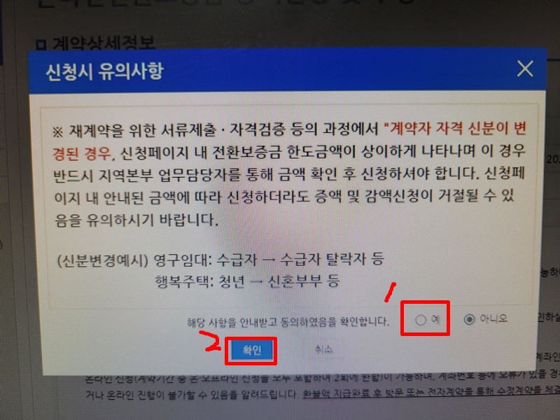 그러고 밑에는 수정 계약 희망하는지 동의 체크를 합니다. "예"에 체크!