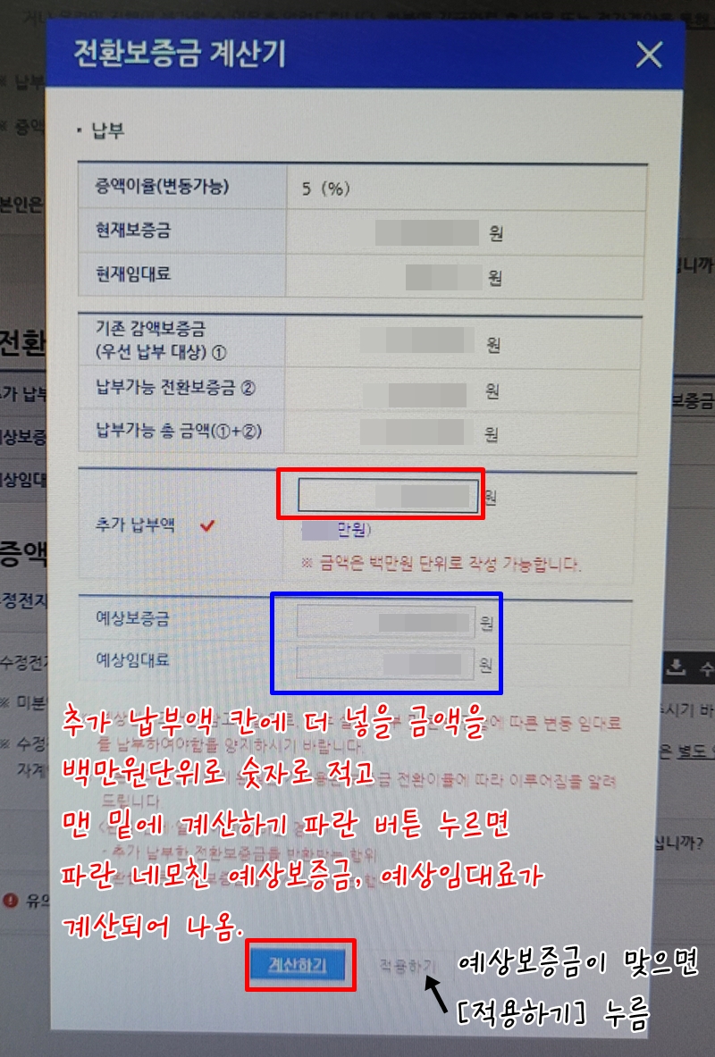 위의 전환보증금 계산기에서 가운데 빨간 네모친 "추가 납부액"에 보증금으로 더 넣을 금액을 숫자로 적어넣고 밑에 [계산하기] 버튼 누르면, 아랫쪽 파란네모친 예상보증금과 예상임대료가 계산되어 금액이 숫자로 써있습니다.