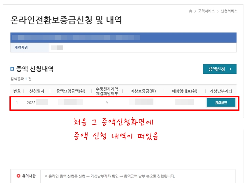 이렇게 신청이 완료되면 처음 화면에 증액 신청 내역이 떠있습니다.