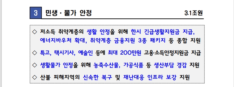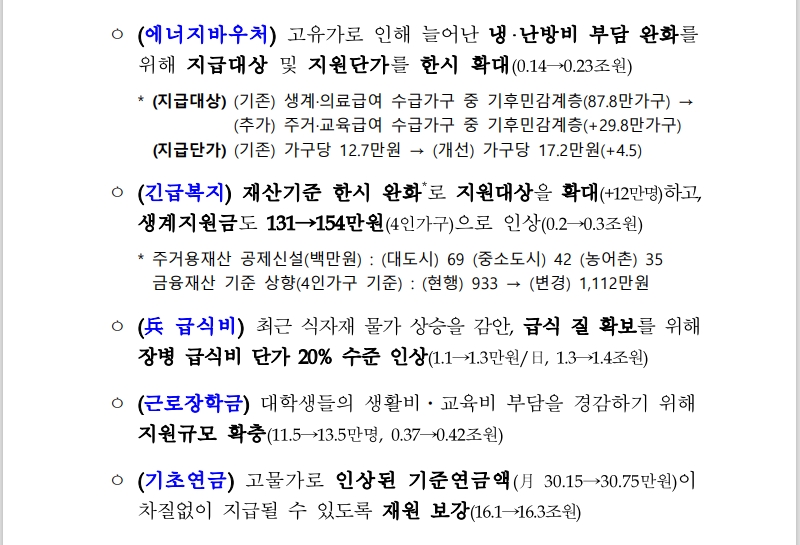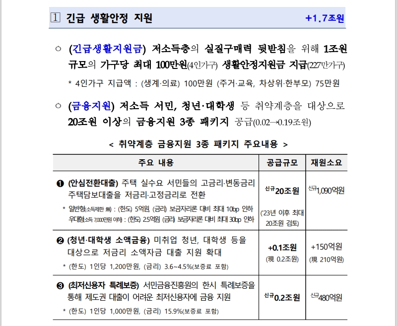 보도자료 중 민생.물가 안정에 보면 "저소득 취약계층의 생활 안정을 위해 한시 긴급생활지원금 지급, 에너지바우처 확대, 취약계층 금융지원 3종 패키지 등 종합지원" 이게 지금 수급자분들에 해당되는 내용인데요,