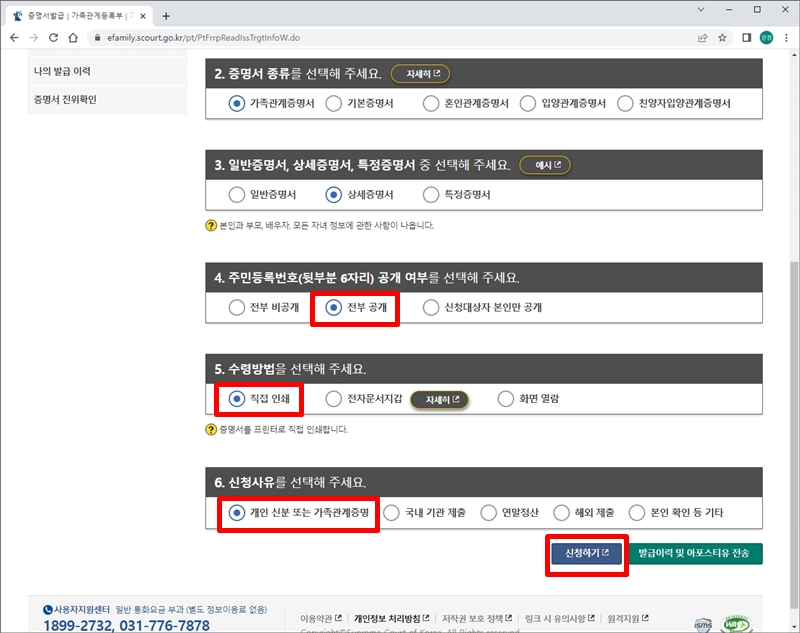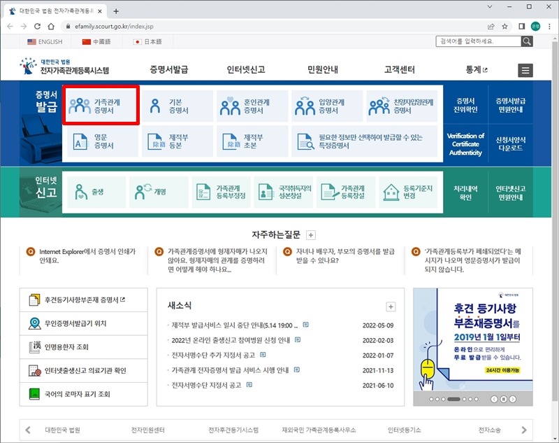 가족관계증명서와 기본증명서는 대한민국 법원 전자가족관계등록시스템 사이트에서 발급이 가능해요.