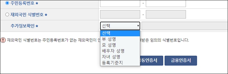추가정보확인은 선택 부분 눌러보면 부 성명, 모 성명, 배우자 성명, 자녀 성명, 등록기준지 이렇게 5가지 중에 하나 고르시고 선택한 사람의 이름을 넣으면되요.