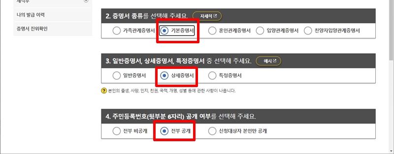 3. 일반증명서, 상세증명서, 특정증명서 중 선택해 주세요.