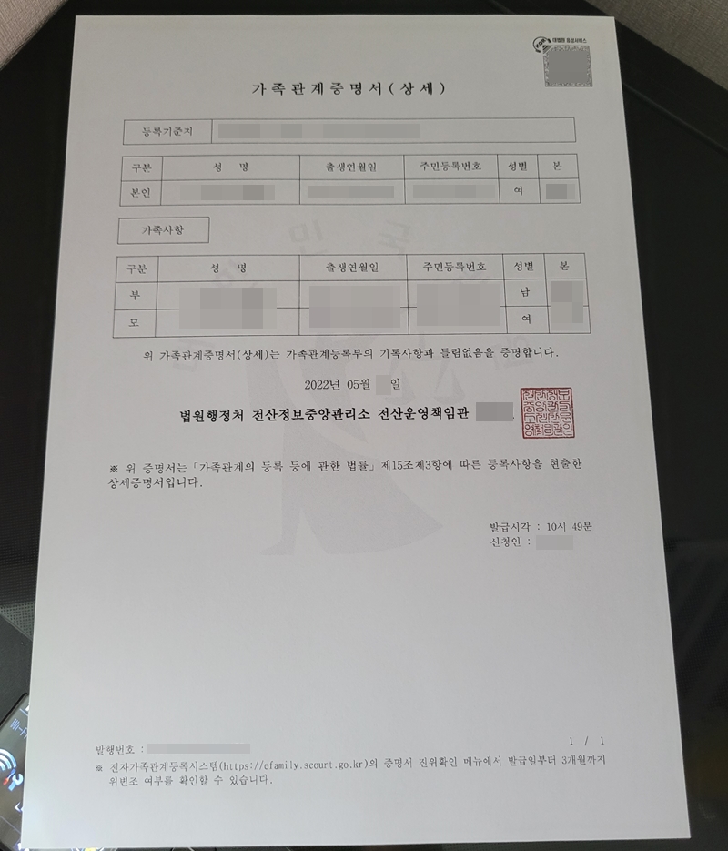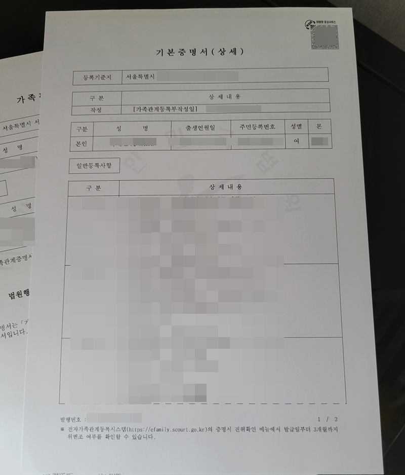 이렇게 프린트한 가족관계증명서네요.